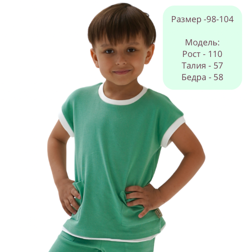 Футболка детская дополнена контрастной отделкой низа и рукава для лучшего определения детьми места входа в футболку. Контрастная отделка - модная изюминка этих моделей. Горловина круглая, но растягивается очень хорошо. Рассчитана одежда на 3+ лет. 2 кармана спереди.