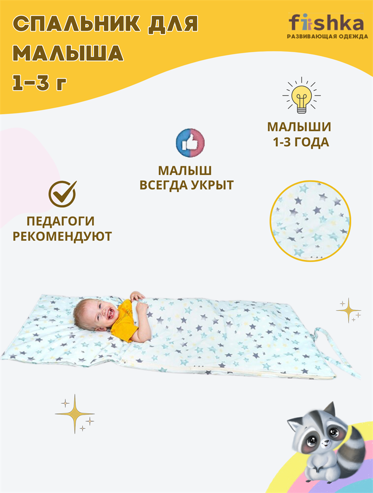 Спальный мешок детский для малышей Toddler возраста 1-3 года. Подходит для сна в частных детских садах, в летний, зимний или весенне-осенний период и дома. Со спальным мешком Fiishka малыш будет укрыт все время пока спит. Спальный мешок из 100% натурального хлопка выполняет роль одеяла, которое не спадает с ребенка в процессе сна. 2 молнии по бокам позволяют расстегнуть спальник и поменять одежду малыша. Для переноски удобно скрутить спальный мешок в рулон и завязать. Для спальника предусмотрена сумка-мешок. При покупке вместе со спальником предусмотрена скидка на сумку.